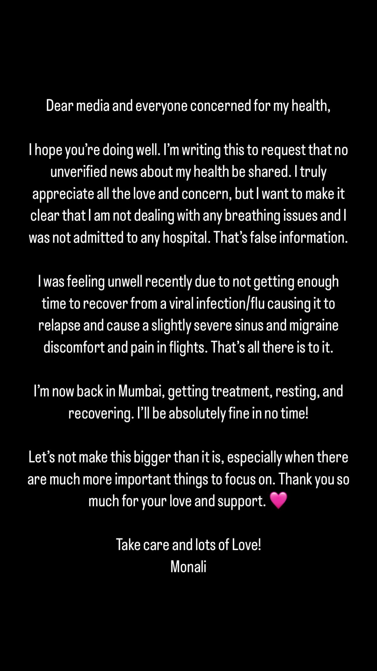 इंस्टाग्राम स्टोरीज पर अपने आधिकारिक बयान में मोनाली ने लिखा, 'प्रिय मीडिया और मेरे स्वास्थ्य के बारे में चिंतित सभी लोगों, मुझे आशा है कि आप ठीक हैं। मैं यह अनुरोध करने के लिए लिख रही हूं कि मेरे स्वास्थ्य के बारे में कोई भी असत्यापित खबर साझा न की जाए। मैं वास्तव में सभी के प्यार और चिंता की सराहना करती हूं, लेकिन मैं यह स्पष्ट करना चाहती हूं कि मुझे सांस लेने में कोई समस्या नहीं है और मुझे किसी अस्पताल में भर्ती नहीं कराया गया है। यह गलत जानकारी है।'