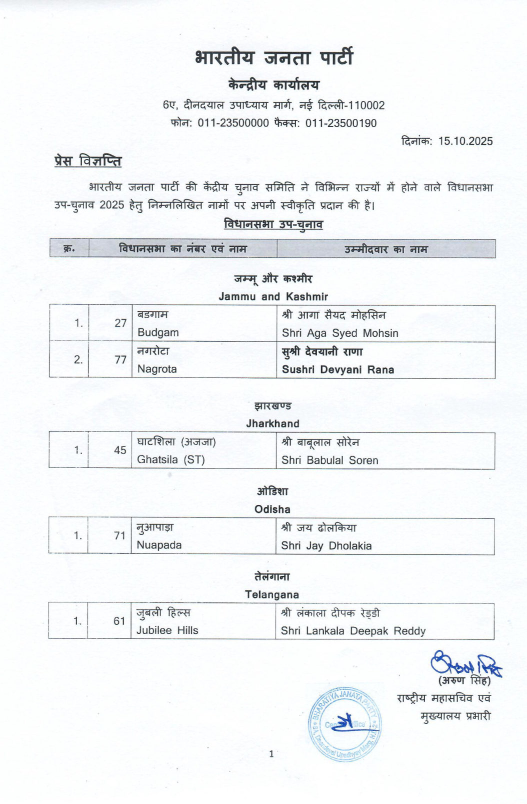 इसके अलावा, झारखंड की घाटशिला (अनुसूचित जनजाति आरक्षित) सीट से बाबूलाल सोरेन को भाजपा का उम्मीदवार बनाया गया है। ओडिशा की नुआपाड़ा सीट से जय ढोलकिया और तेलंगाना की जुबली हिल्स सीट से लंकाला दीपक रेड्डी चुनाव लड़ेंगे।
