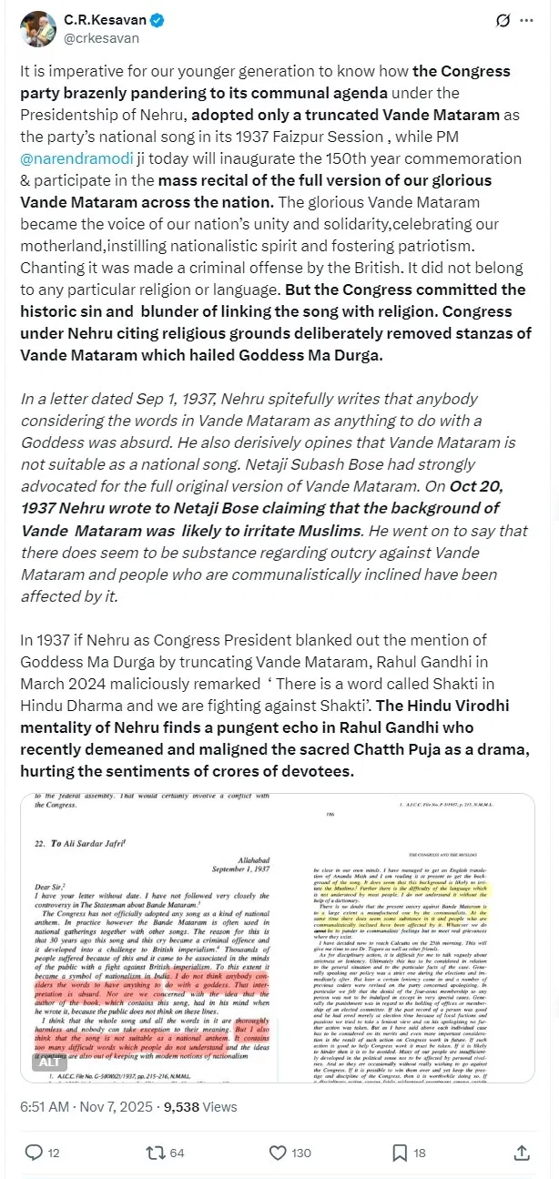 केसवन ने आगे लिखा, “वंदे मातरम किसी एक धर्म या भाषा का गीत नहीं है, यह भारत की आत्मा की अभिव्यक्ति है। लेकिन कांग्रेस ने देवी के प्रति श्रद्धा वाले अंश को हटाकर ऐतिहासिक भूल की।”