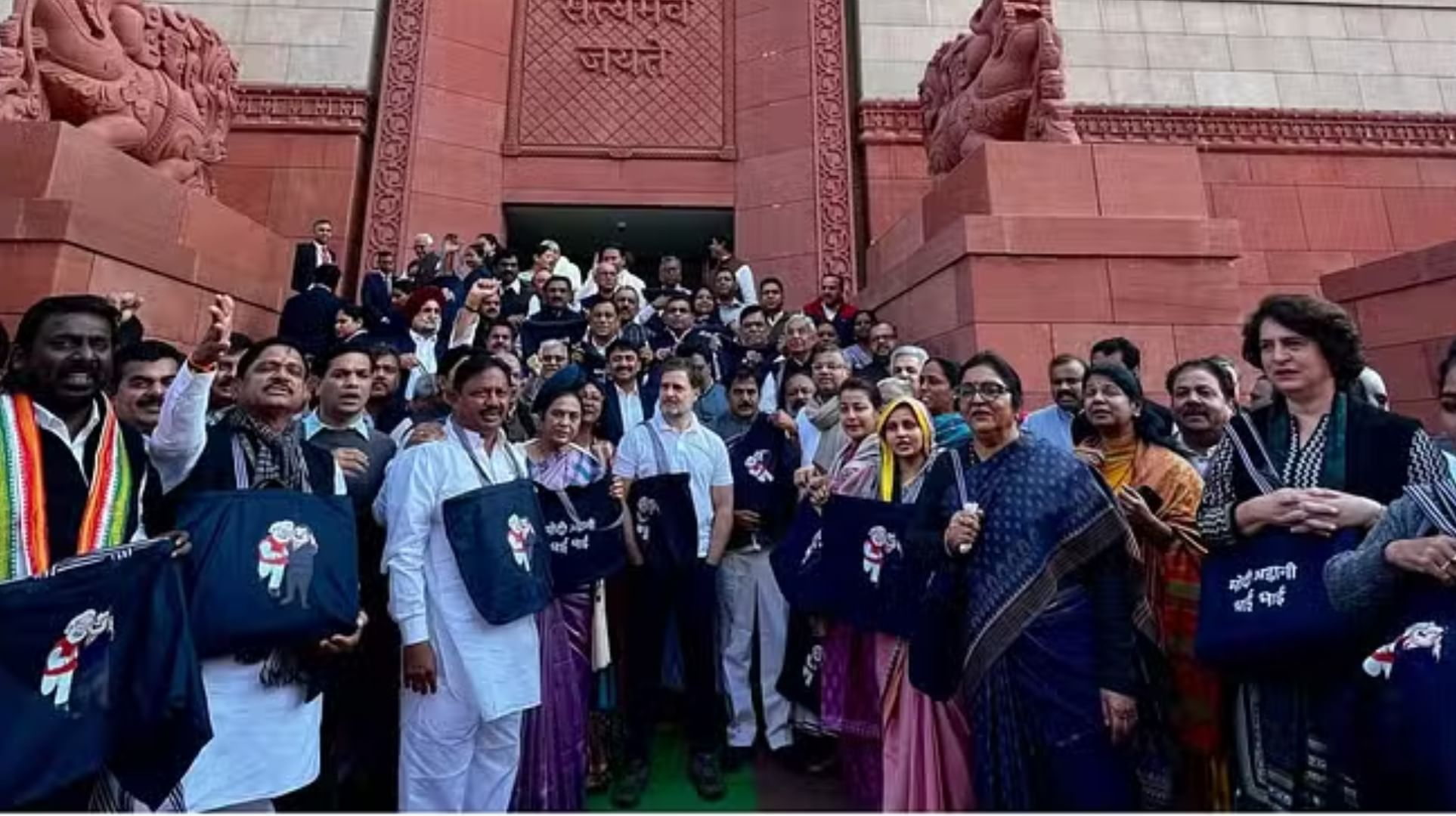 अदाणी मुद्दे पर चर्चा कराने की मांग पर अड़ी कांग्रेस रोजाना नए-नए तरीके से विरोध प्रदर्शन कर रही है। कभी झोला तो कभी टी शर्ट के माध्यम से रोष जता रहे हैं। इसी क्रम में, आज कांग्रेस महासचिव प्रियंका गांधी वाड्रा, कांग्रेस, डीएमके, झारखंड मुक्ति मोर्चा (झामुमो) और वाम दलों के सांसद समेत अन्य लोग मकर द्वार की सीढ़ियों के सामने खड़े थे। इनमें से ज्यादातर तिरंगा और लाल गुलाब लिए हुए थे।