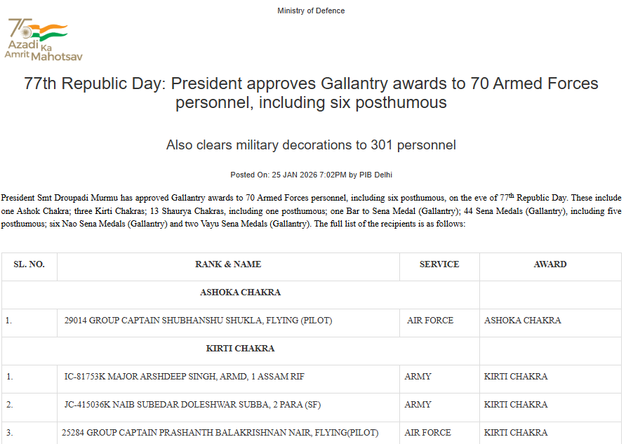 राष्ट्रपति द्रौपदी मुर्मू ने गणतंत्र दिवस से पहले 70 सशस्त्र बलों के जवानों को वीरता पुरस्कारों की मंजूरी दी, जिसमें छह को मरणोपरांत सम्मान दिया जाएगा। इस सूची में एक अशोक चक्र, तीन कीर्ति चक्र और 13 शौर्य चक्र शामिल हैं। कीर्ति चक्र प्राप्त करने वाले जवानों में मेजर अर्शदीप सिंह, नायब सूबेदार डोलेश्वर सुब्बा और ग्रुप कैप्टन प्रशांत बालकृष्णन नायर शामिल हैं।