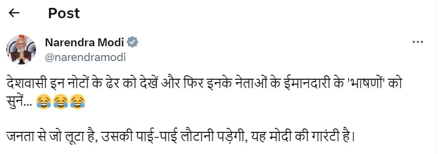 प्रधानमंत्री मोदी ने भी इसे लेकर सोशल मीडिया पर पोस्ट किया है। इस पोस्ट में पीएम मोदी ने लिखा कि 'देशवासी इन नोटों के ढेर को देखें और फिर इनके नेताओं के ईमानदारी से भाषणों को सुनें....जनता से जो लूटा है, उसकी पाई-पाई लौटानी पड़ेगी, यह मोदी की गारंटी है।'