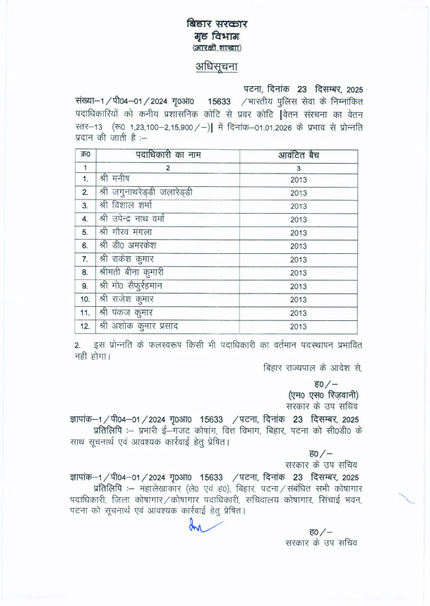 मनीष, जगुनाथ रेड्डी जलारेड्डी, विशाल शर्मा, उपेन्द्र नाथ वर्मा, गौरव मंगला, डी अमरकेश, राकेश कुमार, बीना कुमारी, मो. सैफुर्रहमान, राजेश कुमार, पंकज कुमार और अशोक कुमार प्रसाद को प्रवर कोटि में पदोन्नति दी गई है।