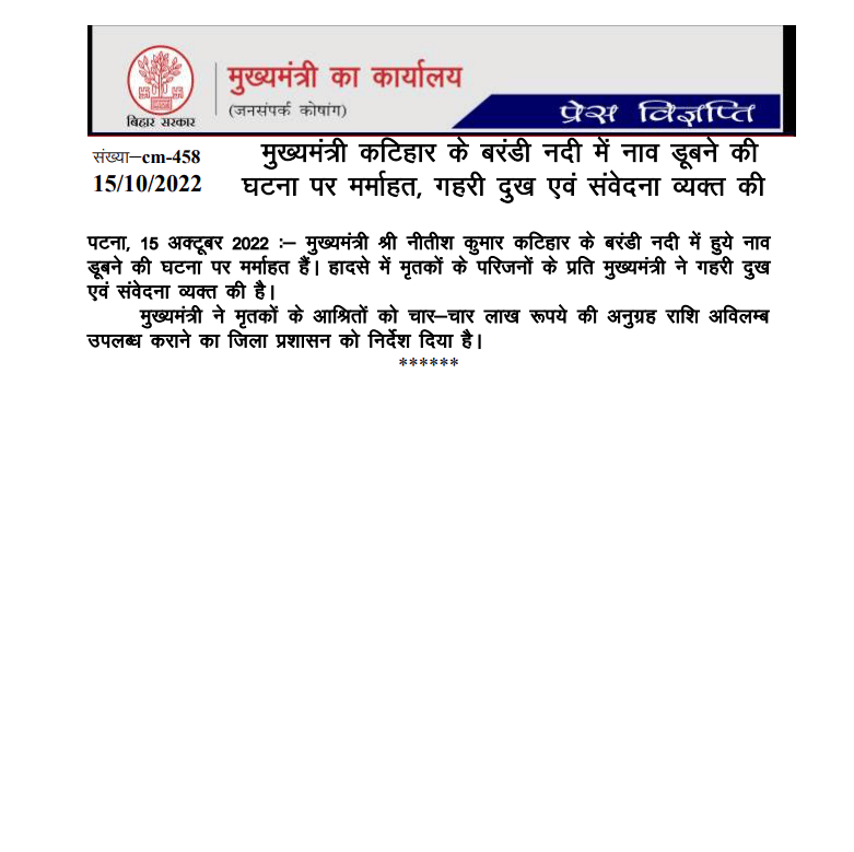 जानकारी के मुताबिक, नाव में सवार ज्यादातर ग्रामीण मजदूरी करके लौट रहे थे। उनके साथ बच्चे और महिलाएं भी थीं। बीच नदी में अचानक नाव डगमगा गई और हादसा हो गया। इस बीच बिहार के मुख्यमंत्री नीतीश कुमार ने जान गंवाने वाले लोगों के परिजनों के लिए 4-4 लाख रुपए की अनुग्रह राशि देने की घोषणा की है।