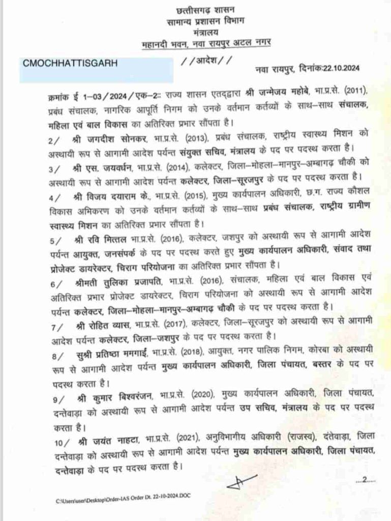 आईएएस जन्मेजय महोबे को महिला एवं बाल विकास विभाग का अतिरिक्त प्रभार सौंपा गया है। मोहला मानपुर और सूरजपुर के कलेक्टर्स का भी ट्रांसफर किया गया है। सूरजपुर कलेक्टर रोहित व्यास को जशपुर की जिम्मेदारी सौंपी गई है। आईएएस अधिकारी एस जयवर्धन को सूरजपुर का कलेक्टर का दायित्व दिया गया है।