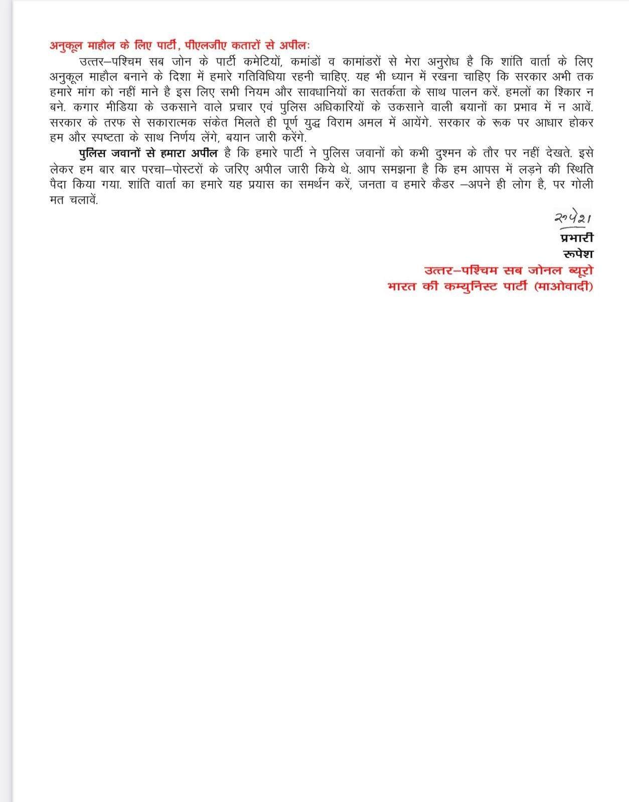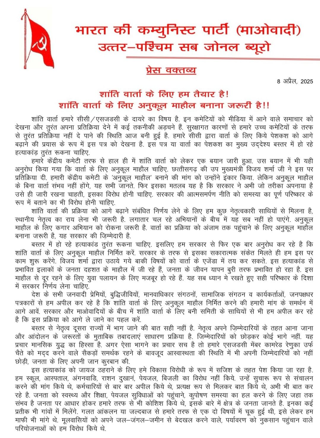 नक्सलियों ने एक बार फिर प्रेस नोट जारी किया है। इसमें सीज फायर और शांति वार्ता की अपील की है। प्रदेश के गृहमंत्री विजय शर्मा से बातचीत के लिए अनुकूल माहौल बनाने की बात कही है। इसके पहले भी नक्सलियों के प्रवक्ता ने प्रेसनोट जारी कर शांति वार्ता के लिये आग्रह किया था। नक्सलियों की उत्तर-पश्चिम सब जोनल ब्यूरो प्रभारी रूपेश ने प्रेस नोट जारी किया है।
