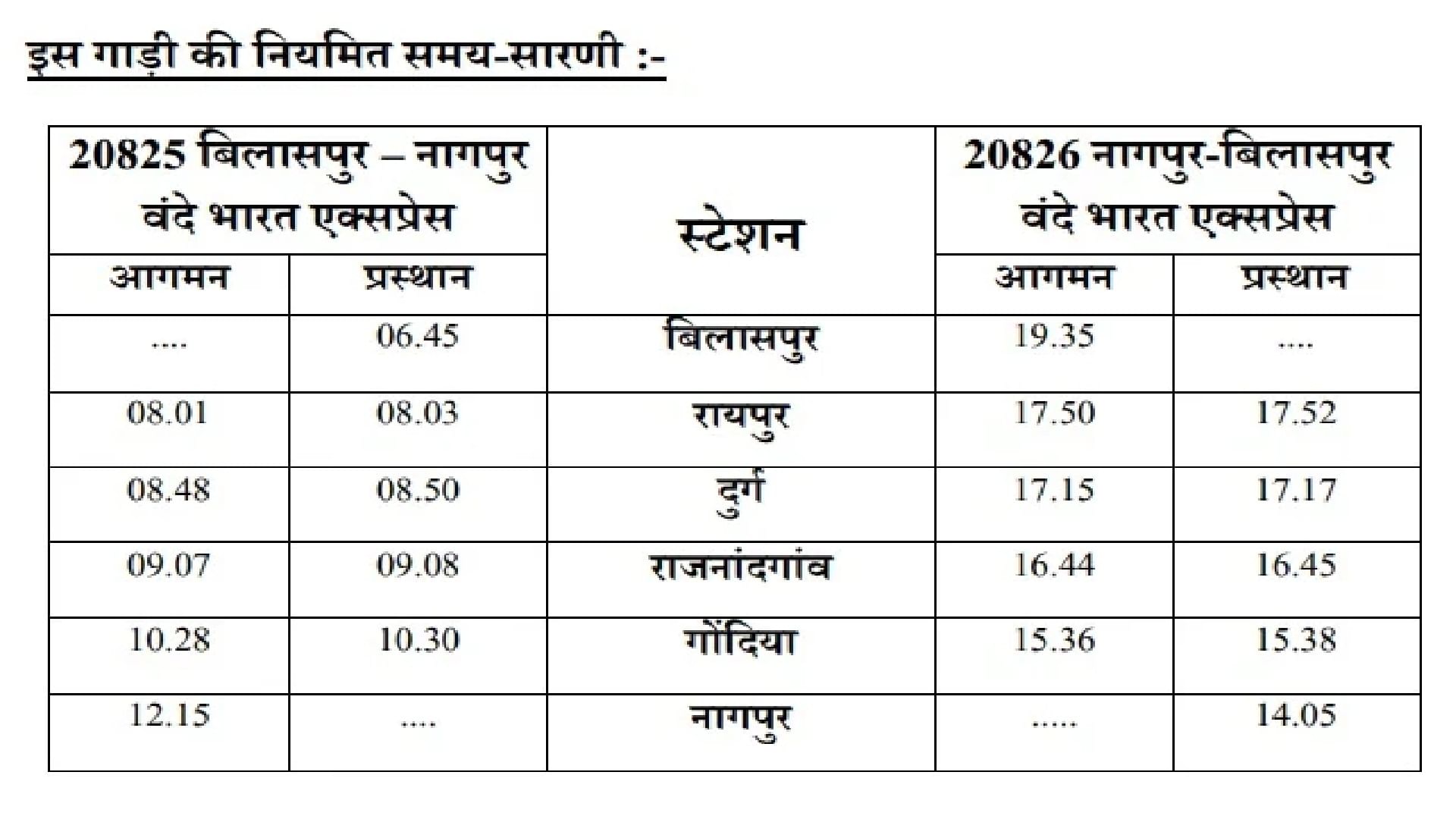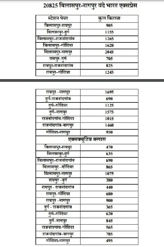 वंदे भारत ट्रेन चलने से यात्रियों को बेहतर और अच्छी सुविधा मिल रही है। IRCTC ने बिलासपुर से नागपुर के लिए चेयरकार का किराया AC-II के बराबर 1077 रुपये, एग्जीक्यूटिव क्लास के लिए 2,045 रुपये टिकट के दाम तय किए गए हैं। ट्रेन में 16 कोच हैं जिनमें 14 चेयर कार और 2 एग्जीक्यूदटव चेयर कार शामिल हैं। कुल बैठने की क्षमता 1128 है।