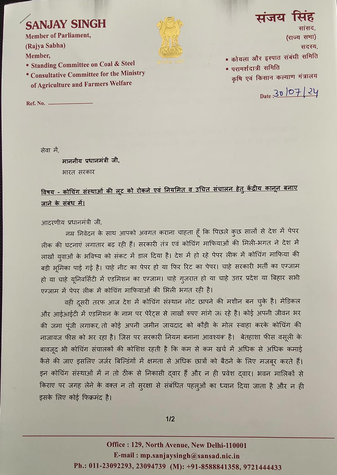 AAP के सांसद ने कहा है कि पेपर लीक में कोचिंग माफियाओं की बड़ी भूमिका पाई गई है। सरकारी तंत्र से इनकी मिलीभगत ने लाखों युवाओं का भविष्य संकट में डाल दिया है। ये लाखों रुपये फीस ले रहे हैं, लेकिन सुरक्षा मानकों को ताक पर रखकर जर्जर बिल्डिंग में क्षमता से अधिक छात्रों को बैठाते हैं।