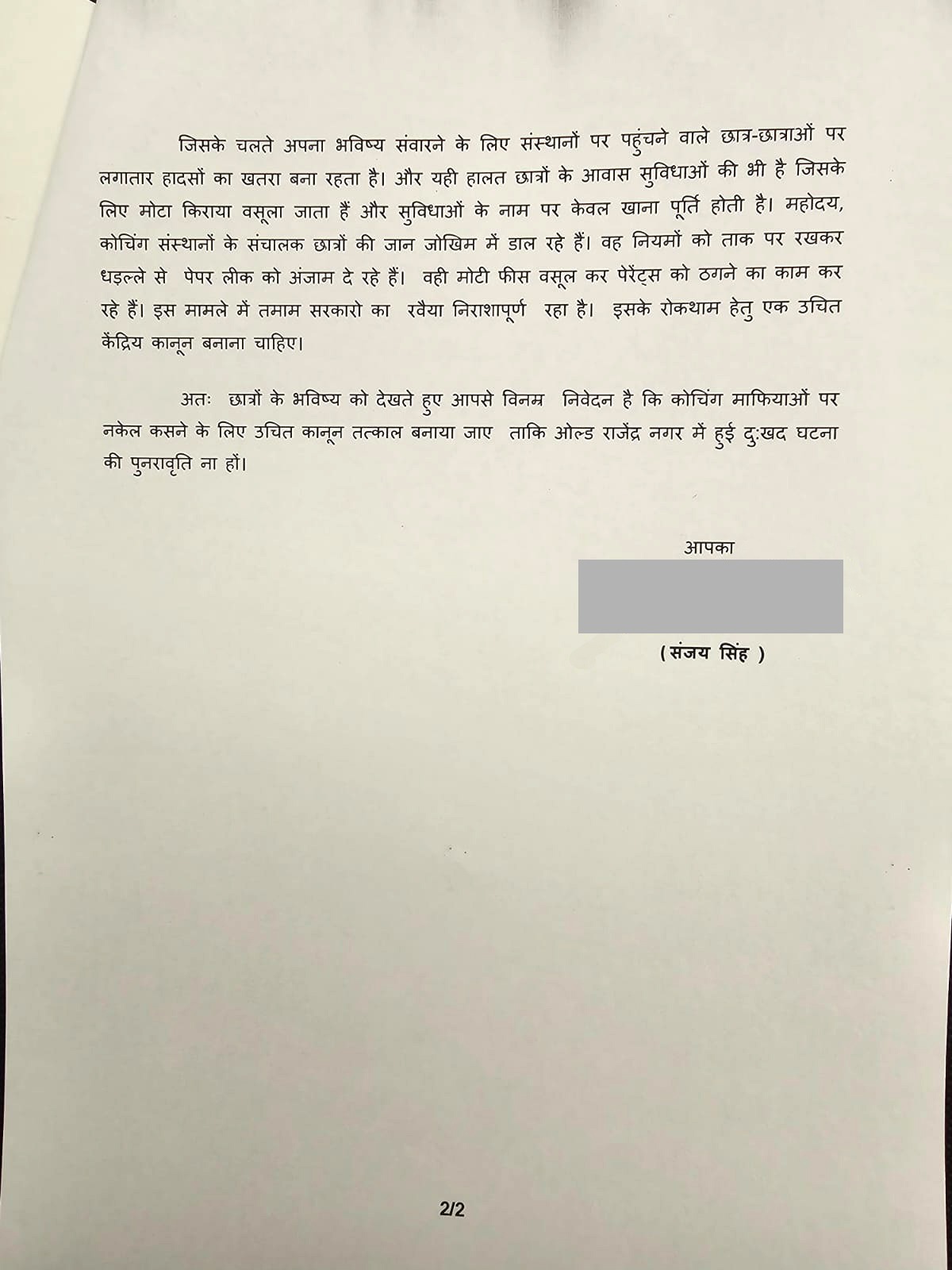 नई दिल्ली। (Old Rajendra Nagar Coaching Incident) आम आदमी पार्टी से राज्यसभा सदस्य संजय सिंह (Sanjay Singh) ने कोचिंग संस्थाओं पर की खुली लूट को रोकने और इनके नियमित संचालन के लिए कानून बनाने की मांग करते हुए प्रधानमंत्री को पत्र लिखा है।