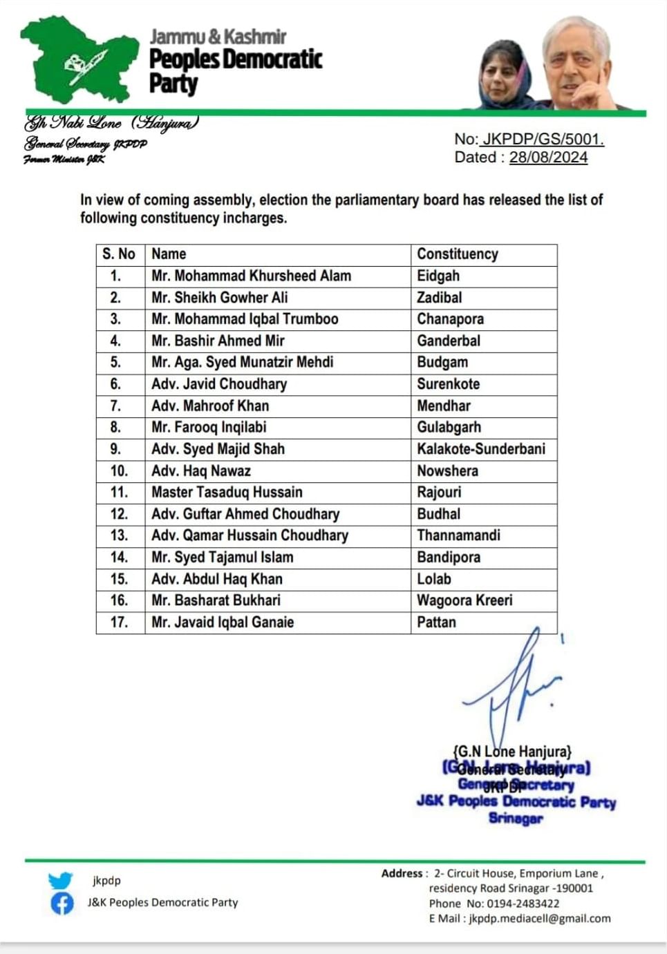 पीपुल्स डेमोक्रेटिक पार्टी (पीडीपी) ने बुधवार को 17 उम्मीदवारों की सूची जारी की है। जिसमें ईदगाह विधानसभा क्षेत्र से मोहम्मद खुर्शीद आलम, गांदरबल से बशीर अहमद मीर, नौशेरा से हक नवाज को चुनाव मैदान में उतारा है।