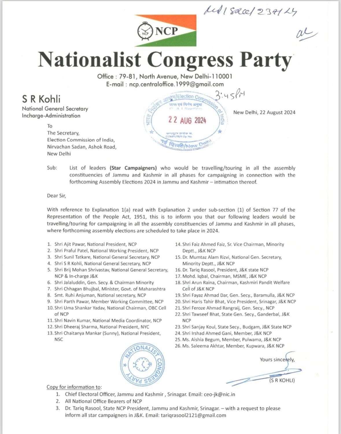 राष्ट्रवादी कांग्रेस पार्टी ने जम्मू-कश्मीर विधानसभा चुनाव के लिए स्टार प्रचारकों की सूची जारी की है। इस सूची में 26 प्रचारकों के नाम शामिल है, जिसमें अजित पवार, सुनील तटकरे और प्रफुल्ल पटेल के नाम शामिल हैं।