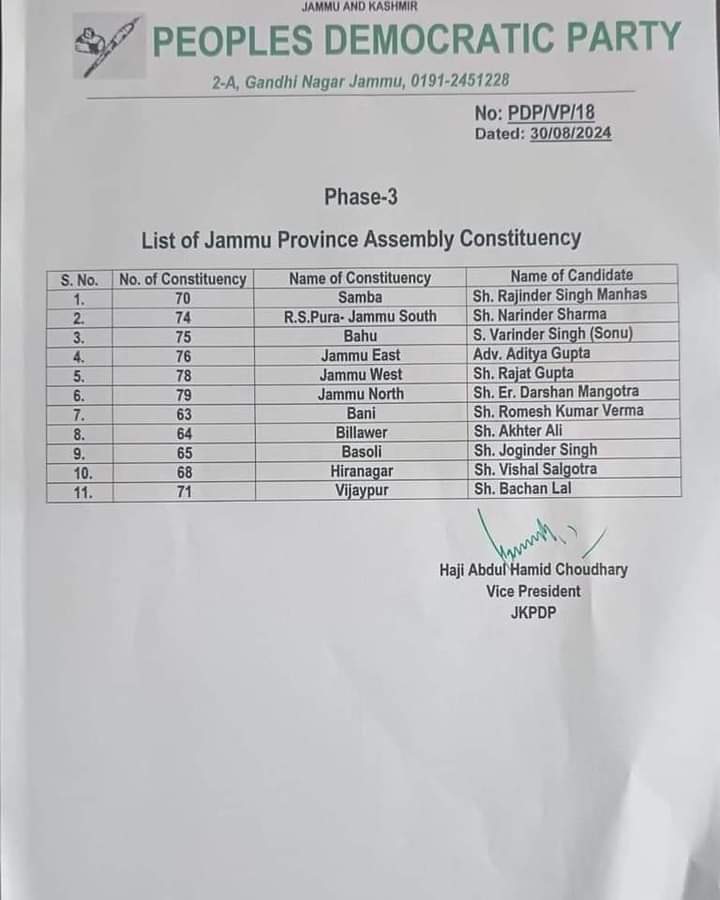 जम्मू-कश्मीर में विधानसभा चुनाव के लिए महबूबा मुफ्ती की पीपुल्स डेमोक्रेटिक पार्टी (PDP) ने उम्मीदवारों की एक और लिस्ट जारी कर दी है। इस सूची में पीडीपी ने 11 नए नामों का एलान किया है। जारी नोटिफिकेशन के अनुसार पार्टी ने तीसरे चरण के लिए प्रत्याशियों का एलान किया है।