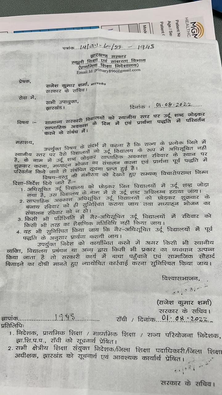 झारखंड प्राथमिक शिक्षा विभाग ने 01 अगस्त, 2022 को एक नोटिस जारी करते हुए आदेश दिया है कि सभी गैर उर्दू स्कूलों में से उर्दू नाम तत्काल प्रभाव से हटाए जाएं। वहीं, आदेश में यह भी कहा गया है कि सभी गैर उर्दू स्कूलों में साप्ताहिक छुट्टी रविवार को होगी न कि शुक्रवार को। इसके साथ ही इन स्कूलों में सुबह की प्रार्थना भी पहले की तरह शुरू कराई जाए।