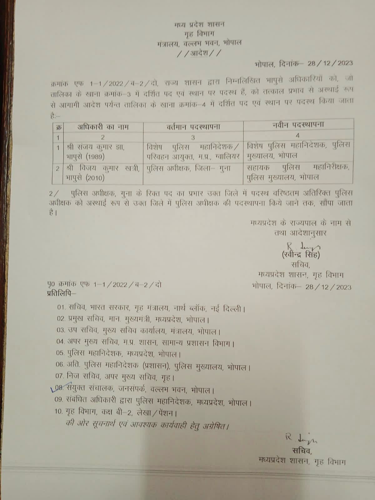 मध्य प्रदेश सरकार के गृह विभाग की तरफ से जारी आदेश में विशेष पुलिस महानिदेशक/परिवहन आयुक्त मध्य प्रदेश ग्वालियर संजय कुमार झा को विशेष पुलिस महानिदेशक, पुलिस मुख्यालय पदस्थ किया है। इसके साथ ही गुना के पुलिस अधीक्षक विजय कुमार खत्री को सहायक पुलिस महानिदेशक पुलिस मुख्यालय पदस्थ किया गया है। पुलिस अधीक्षक गुना के रिक्त पद का प्रभार जिले में पदस्थ वरिष्ठतम अतिरिक्त पुलिस अधीक्षक को अस्थाई रूप से पुलिस अधीक्षक की पदस्थापना किए जाने तक सौंपा गया है।