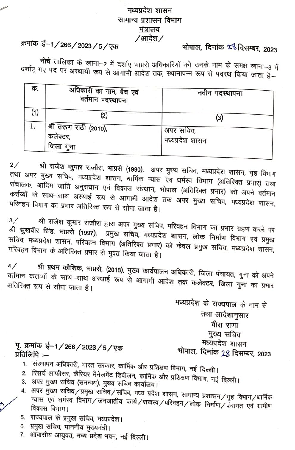 वहीं, सामान्य प्रशासन विभाग की तरफ से जारी आदेश में गुना कलेक्टर तरुण राठी को हटा कर मंत्रालय में अपर सचिव पदस्थ किया गया है। उनकी जगह पर गुना के मुख्य कार्यपालन अधिकारी प्रथम कौशिक को अस्थाई रूप से कलेक्टर का अतिरिक्त प्रभार सौंपा गया है। इसके अलावा अपर मुख्य सचिव गृह विभाग राजेश कुमार राजौरा को अस्थायी रूप से आगामी आदेश तक अपर मुख्य सचिव परिवहन विभाग का अतिरिक्त रूप से प्रभार सौंपा गया। प्रमुख सचिव परिवहन विभाग के अतिरिक्त प्रभार से आईएएस अधिकारी सुखबीर सिंह को मुक्त किया गया।