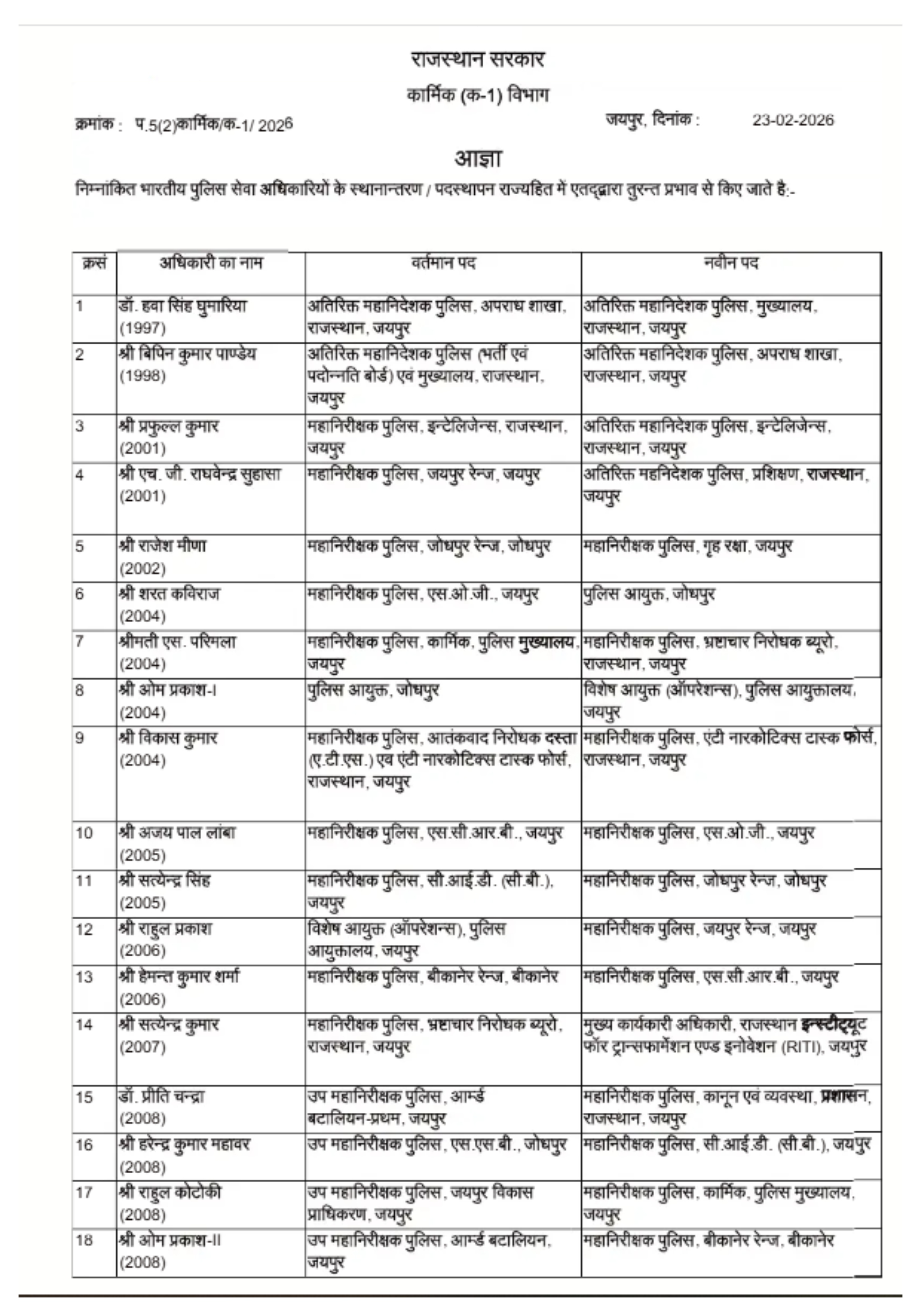 जयपुर। राजस्थान में भजनलाल शर्मा की नेतृत्व वाली सरकार ने सोमवार देर रात प्रशासनिक फेरबदल करते हुए 21 आईपीएस अधिकारियों के पदस्थापन की घोषणा की है। इस सूची में जयपुर और जोधपुर के उच्च पदस्थ अधिकारियों के नाम भी शामिल हैं।