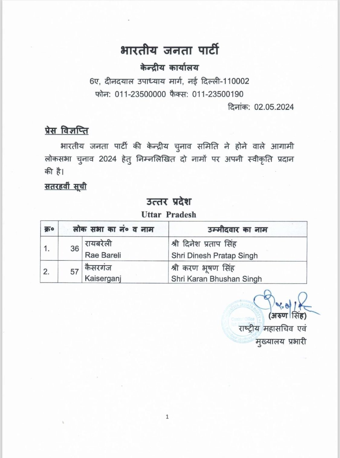 भाजपा ने उत्तर प्रदेश की रायबरेली और कैसरगंज लोकसभा सीट के लिए उम्मीदवार का एलान कर दिया है। भाजपा ने रायबरेली से दिनेश प्रताप सिंह और कैसरगंज से करण भूषण सिंह को टिकट दिया है। करण भूषण सिंह कैसरगंज सीट से मौजूदा सांसद बृजभूषण शरण सिंह के छोटे बेटे हैं।