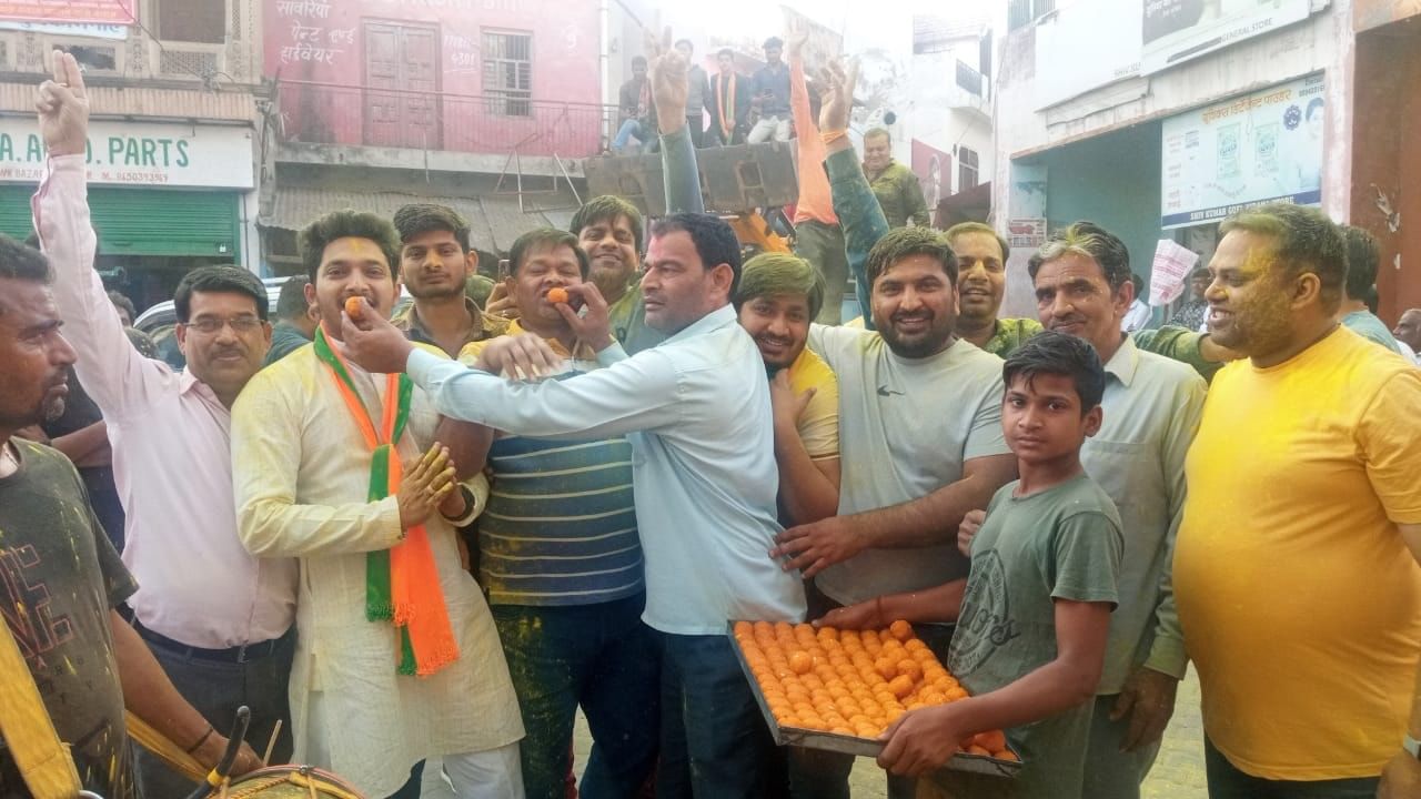 जीत का जश्न मनाते सपा प्रत्याशी रमाकांत यादव अपने समर्थकों के साथ।