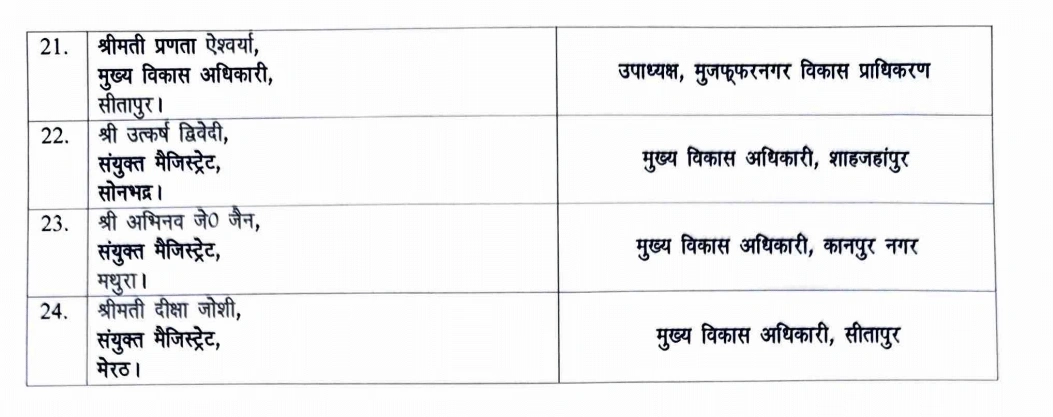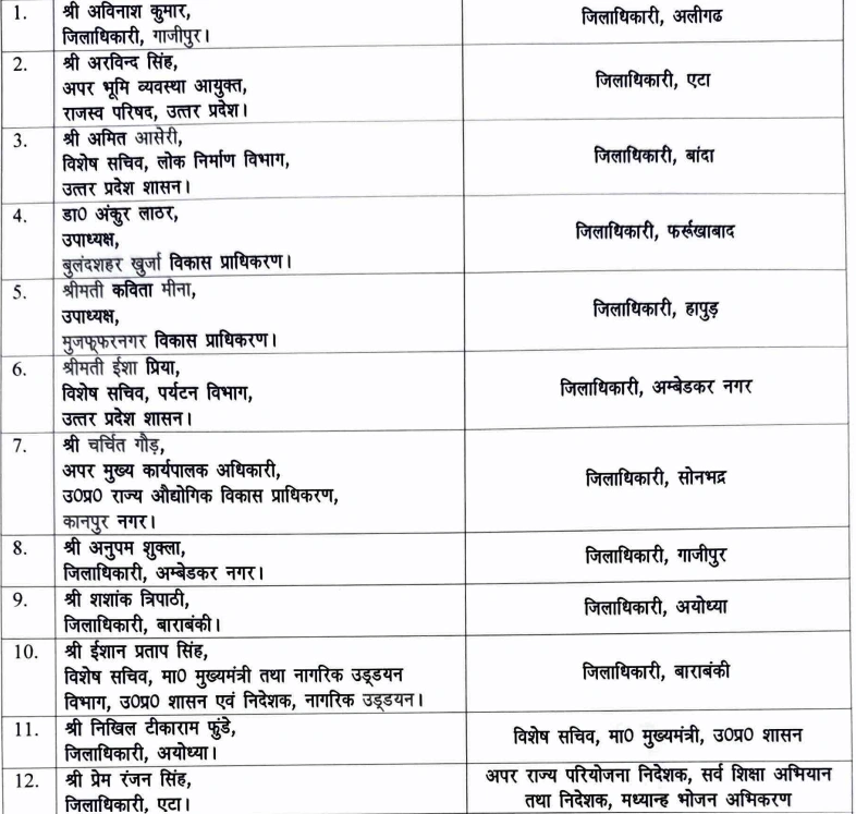 ताजा आदेश के तहत कई जिलों में नए डीएम नियुक्त किए गए हैं। गौरांग राठी को झांसी, कुमार हर्ष को बुलंदशहर, अरविंद कुमार चौहान को सहारनपुर, मनीष बंसल को आगरा और नितिन गौड़ को अमरोहा का जिलाधिकारी बनाया गया है। वहीं अन्नपूर्णा गर्ग को श्रावस्ती, आलोक यादव को शामली, अभिषेक गोयल को हमीरपुर और सरनजीत कौर को रायबरेली की जिम्मेदारी सौंपी गई है।
