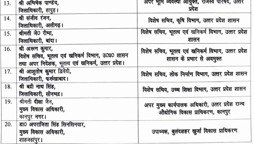 इसके अलावा प्रशासनिक स्तर पर भी कई अहम बदलाव किए गए हैं। आशुतोष निरंजन को परिवहन आयुक्त बनाया गया है, जबकि किंजल सिंह को माध्यमिक शिक्षा विभाग में सचिव की जिम्मेदारी दी गई है। दुर्गा शक्ति नागपाल को देवीपाटन मंडल का मंडलायुक्त नियुक्त किया गया है।