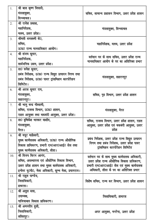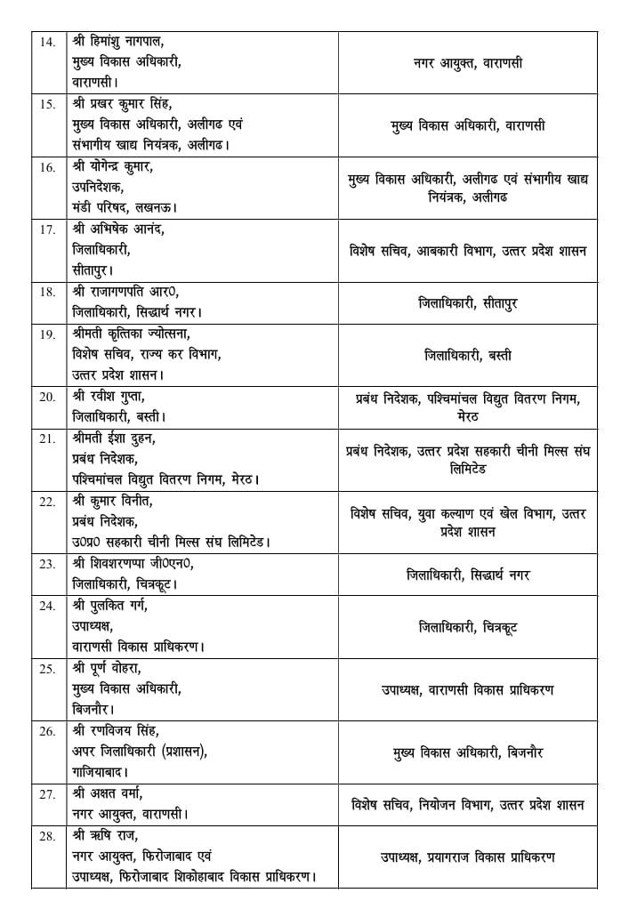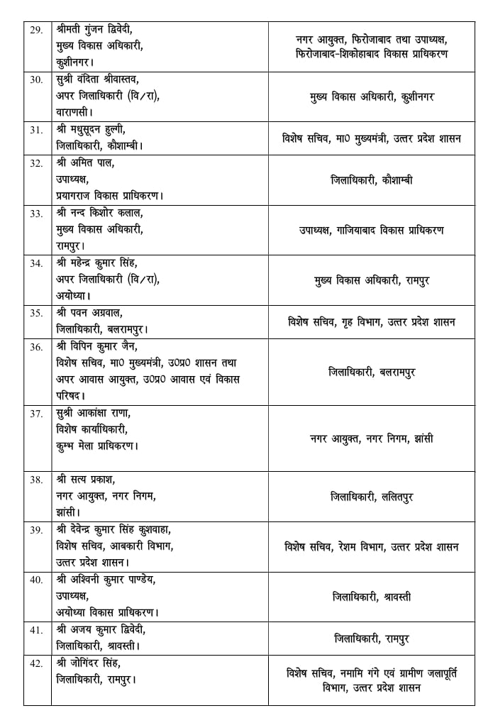 यूपी में 46 अफसरों का तबादला किया गया है। इसमें आईएएस कृतिका ज्योत्सना को बस्ती का डीएम, वाराणसी के सीडीओ हिमांशु नागपाल को वाराणसी का नगर आयुक्त बनाया गया है। वाराणसी की एडीएम वंदिता श्रीवास्तव को कुशीनगर का सीडीओ बनाया गया है। रामपुर के सीडीओ नंद किशोर कलाल को गाजियाबाद का उपाध्यक्ष बनाया गया है। मिर्जापुर के आईएएस बाल कृष्ण त्रिपाठी को सचिवालय सामान्य प्रशासन बनाया गया है। उनकी जगह राजेश कुमार की नियुक्ति की गई है।सीतापुर के जिलाधिकारी अभिषेक आनंद को विशेष सचिव आबकारी बनाया गया है। वहीं, सिद्धार्थ नगर के डीएम राजा गणपति आर को डीएम सीतापुर बनाया गया है। कौशांबी और बलरामपुर के भी जिलाधिकारी बदल गए हैं। दूसरी ओर राजेश कुमार को मिर्जापुर का नया मंडलायुक्त नियुक्त किया गया है। अन्य तबादलों में प्रखर सिंह को वाराणसी का मुख्य विकास अधिकारी (सीडीओ) बनाया गया है।