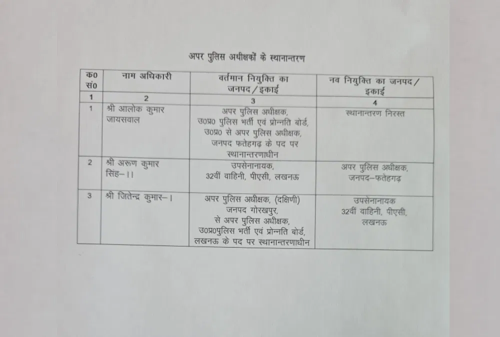 उत्तर प्रदेश में सोमवार को तीन अपर पुलिस अधीक्षकों के पदस्थापन में बदलाव किया गया। हालांकि, उत्तर प्रदेश पुलिस भर्ती एवं प्रोन्नति बोर्ड में तैनात आलोक कुमार जायसवाल का स्थानांतरण आदेश वापस ले लिया गया है और वे अपने वर्तमान दायित्वों पर ही बने रहेंगे।