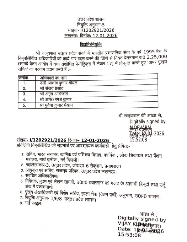 उत्तर प्रदेश सरकार ने अपने प्रशासनिक ढांचे को मजबूत करने के लिए महत्वपूर्ण कदम उठाया है। इस क्रम में पांच वरिष्ठ आईएएस अधिकारियों को पदोन्नति देते हुए अपर मुख्य सचिव (ACS) का पद सौंपा गया है। इस लिस्ट में संजय प्रसाद और आशीष गोयल जैसे अनुभवी अधिकारी शामिल हैं।