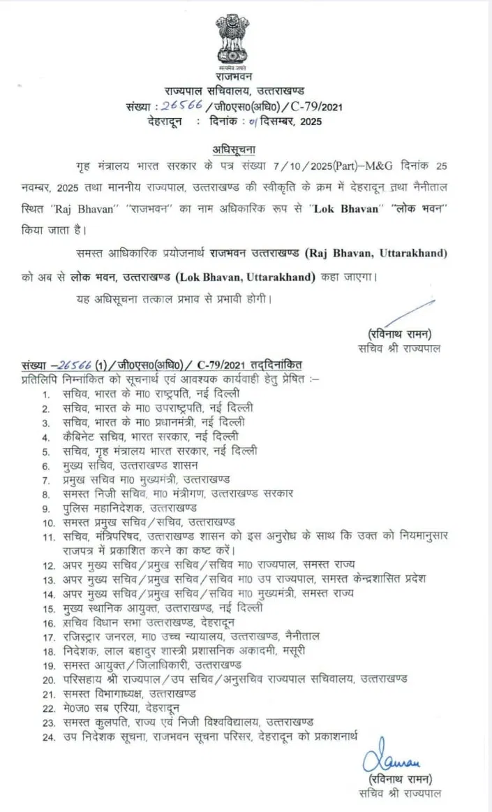 उत्तराखंड में राजभवन के नाम में बदलाव किया गया है। अब देहरादून और नैनीताल में राजभवन लोक भवन के नाम से जाना जाएगा। राजभवन सचिवालय की ओर से इसका आदेश जारी कर दिया गया है।