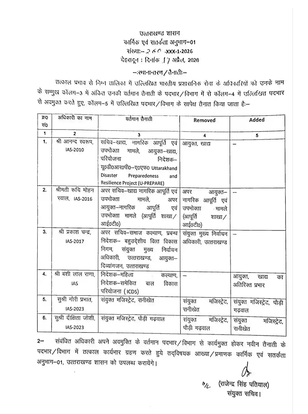उत्तराखंड में धामी सरकार ने प्रशासनिक स्तर पर बड़ा फेरबदल करते हुए शुक्रवार को कई अधिकारियों के तबादले किए हैं। इस बदलाव के तहत सचिवालय सेवा से जुड़े 26 पीसीएस अधिकारियों का स्थानांतरण किया गया है, जबकि 6 आईएएस अधिकारियों के कार्यभार में भी परिवर्तन किया गया है।